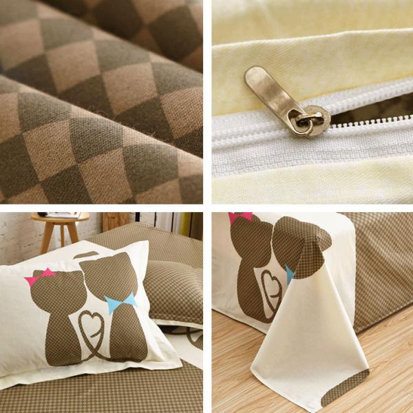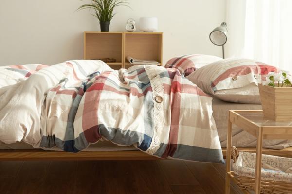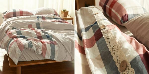 5. Mẫu họa tiết ca rô to bản được kết hợp khéo léo với vải ren làm đường viền vỏ chăn cùng những hạt nút đính giả gỗ mộc mạc.